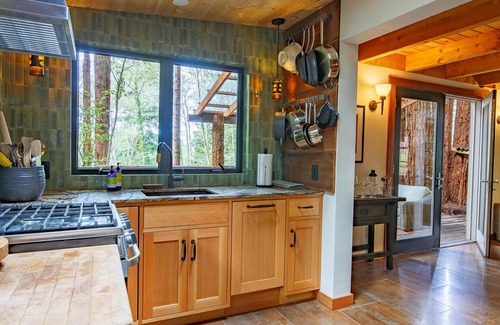 This incredible space has been the inspirational hub for designing the most creative projects in Humboldt during the past 18 years. Now it has been reborn as an immersive space to enjoy the redwoods. Every inch has been thoughtfully designed to allow our guests to feel the enveloping majestic nature of the surrounding forest. Upon arrival, a golf cart awaits for your journey through the woods, to the upper landing of the raised boardwalk crossing over a seasonal creek bringing you to The Studio.