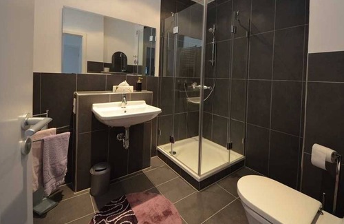 You live in an elegant, spacious 2 room apartment. A large bedroom with 180cm double bed and a sofa bed can accommodate 3 people. For shorter stays an occupancy of 2 for 4 persons is possible. In the living room separated by a sliding door is a cozy sitting area, a large flat screen TV, and a large dining table. A sleeping possibility is available here. The bathroom has a spacious shower. The kitchen is a fully equipped kitchen with dishwasher, oven, ceramic hob, microwave and washing machine, fridge / Gefriekombination. The kitchen is fully equipped with oven, microwave,