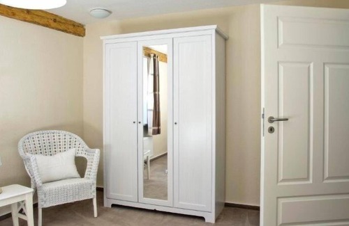 The apartment was completely renovated and refurbished in November 2012. It is barrier-free and has special handicap equipment. The large bathroom with two sinks, wellness shower and underfloor heating is particularly comfortable. The living room enjoys many windows that provide a lot of brightness. There you will find another sofa bed for 2 people. The bedrooms can be completely darkened. The beds have increased seat heights of 0.54 and 0.70 m. The parking spaces at the house and right up to the front door are fully illuminated by motion detectors. The hallway with kitchen block offers plenty of space for children to play. In the living room you will find a large dining table for 6 people. We call the second, not barrier-free bedroom the princess room because it is equipped with a four-poster bed.
