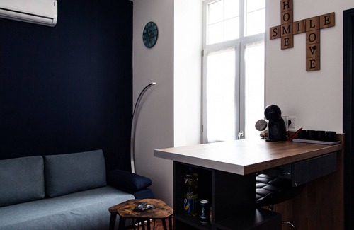 Free public transport. In an old mansion, studio on the courtyard side with a sofa bed (160 cm), equipped kitchen and dining area on a worktop in bar mode.
