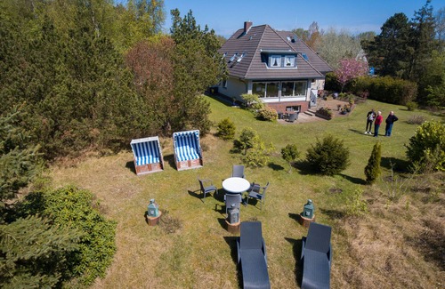 Enjoy the shared garden at Kapitänshaus Passat in Wittdün, featuring beach chairs, seating areas, deck chairs, and a gas/charcoal grill. The property is set within typical Amrum heathland and dune landscape.
