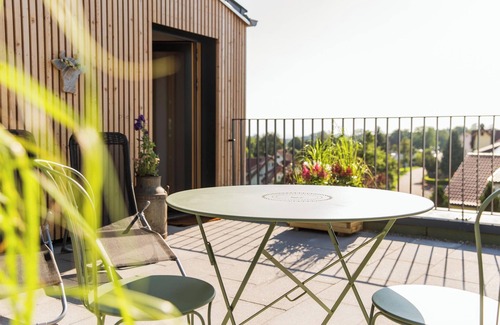 Guests have access to the private and sunny roof terrace (16m²) with a parasol and furniture as well as to the fenced communal garden area with a barbecue and nice playground for children.