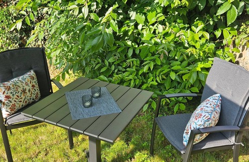 The bright 70 m² apartment is located in the quiet district of Iversheim in Bad Münstereifel, North Rhine-Westphalia, and accommodates up to 2 guests. You will find a bedroom with a spacious box spring bed (three pillows per person) and a large wardrobe. The bathroom is equipped with a bathtub with integrated shower. Your private, fully equipped kitchen features a ceramic hob, air fryer, oven, dishwasher, coffee machine with pads, filter coffee machine with coffee, milk and sugar, kettle with various teas, toaster, and a fridge with freezer compartment. Further amenities include Wi-Fi (suitable for video conferencing), private smart TV, underfloor heating throughout the living area, electric shutters, hairdryer, and a complete towel package (one bath towel, one hand towel, two guest towels per person). Books and games provide relaxing evenings.