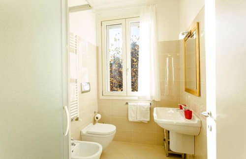 The bathroom with glass shower cubicle, toilet, bidet and washbasin of excellent quality. The ceramic guarantees easy cleaning and hygiene.