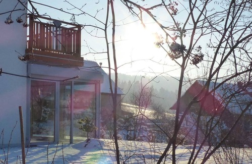 Our apartment "green" for 2 persons, - consists of a spacious living room with dining area, a high-quality and comfortable couch, reclining chair with footstool and a fully equipped kitchen with dishwasher, coffee maker, Senseo pad machine, toaster, microwave, kettle, bread slicer, Egg cooker, fridge with freezer *** and 4-plate stove with oven .-- LCD TV, DVD player and hi-fi music system - wireless internet included - own telephone line, costs included, - a bedroom with additional flat screen TV, Radio alarm clock and safe, Fliegenschutzvorhang .-- a bathroom with shower, toilet and hair dryer, - Non smoking apartment, no pets. - Extra beds available for 2 more people. - Covered south-facing balcony (size 16 sqm) with generous awning. Wonderful view over meadows and forest.