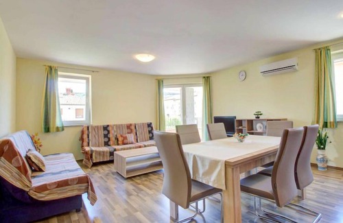 "Apartment Valdi", 3-room apartment 70 m2 on 1st floor. Simple furnishings: with 1 double sofabed and cable TV (flat screen). Exit to the balcony. 1 room with 1 double bed. Exit to the balcony. 1 room with 1 double bed. Open kitchen (oven, dishwasher, 4 ceramic glass hob hotplates, freezer) with dining table. Shower/WC. Electric heating. Balcony 15 m2. Terrace furniture. Of the garden. Facilities: Internet (WiFi).