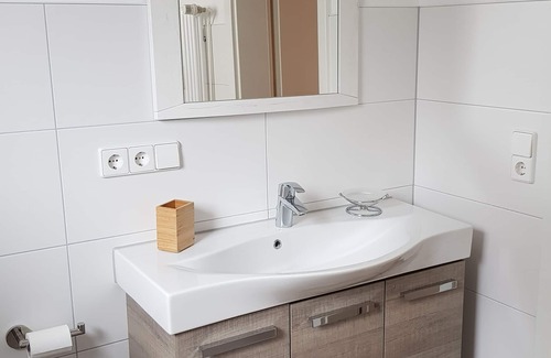 You spend the night in a tastefully furnished apartment with a 1.80 m wide double bed in the bedroom and a Schalfcouch of pattern ring (real mattress) in the kitchen. The apartment is equipped with a kitchenette (oven, dishwasher and a washing machine, coffee maker and microwave). Located on the ground floor of a 3 family house and free parking right outside the door. Max . 2 dogs are allowed.