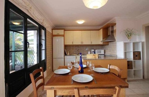 La Cancela apartment is a beautiful 70 m2 holiday home with a large 300m2 outdoor space with terrace and garden. It has a living-dining room with free Wi-Fi, a Smart TV with a flat screen and a dining table, ideal for having breakfast contemplating the views through the window or using it to telework. The kitchen, open to the living room, is fully equipped with a ceramic hob, oven, microwave, coffee maker, toaster, kettle, electric juicer, dishwasher, fridge, washing machine and complete kitchenware. It also offers 2 bedrooms, both with 2 single beds, large closets and large windows that allow you to enjoy views of the gardens and natural light.From the living room, there is access to the terrace covered with a pergola and an outdoor table that allows you to sit outdoors to contemplate the landscape and enjoy the tranquility of the town. The apartment has a large garden with cacti and plants from the island.
