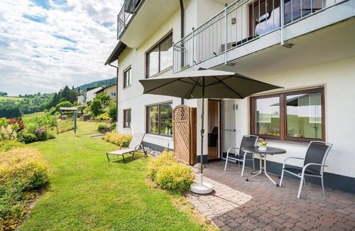 The apartment has a separate entrance, the kitchen is fully furnished and equipped with coffee machine, kettle, dishwasher, electric stove with ceramic hob, oven, microwave, crockery. The bathroom with shower and WC, hairdryer, two separate bedrooms - 1x bedroom with double bed, 1x bedroom with bunk bed. Living area with flat-screen TV, satellite/cable, WLAN. From the apartment you have direct access to the south-facing garden terrace with a wonderful view. Bed linen and towels are provided, final cleaning is included. Non-smoking apartment. Dogs are allowed in this apartment on request/ 8 € per day.