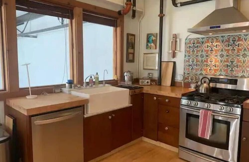 This Artist Residency, is a creative, comfortable, one bedroom, private loft nestled within our sculpture studio and is located in the Mission Creek neighborhood. Enjoy fine art, a gourmet kitchen, large windows with northern light and a garden view, a king size bed, and a natural gas franklin stove. Near historic Rainbow Grocery, Heath Ceramics, artistic cafe's, Guss’ community market, local art galleries, theaters, and parks. Monthly Rental