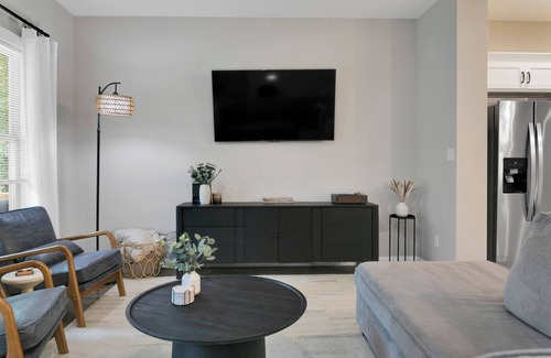 Our chic living room boasts a 60" smart TV, ideal for movie nights or streaming your favorite shows. Sink into the cozy L-shaped couch, piled with throw pillows and blankets for ultimate relaxation. The couch can be used as a bed for an extra guest if needed! With an open floor plan, you'll find the kitchen and dining areas just steps away, making this space perfect for socializing and gathering for family meals. Experience comfort and convenience all in one cozy spot!