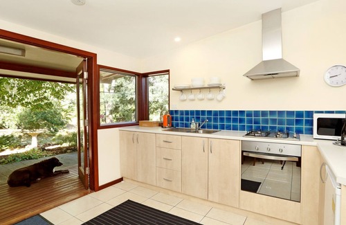 The kitchen features an electric oven, gas cooktop with rangehood, microwave, refrigerator and plenty of bench space for food preparation. The area is heated by a petite combustion heater which will quickly heat the area in the depths of winter. Welcoming comfy lounge chairs await with LCD TV and DVD player available. The queen size bed offers a private valley view, and the bathroom features a shower, wash basin and toilet. Outside in the sheltered garden, enjoy an al fresco setting with lovely views. The Retreat has a minimal environmental footprint - rainwater is harvested on the property, wastewater is treated on the property, a recycling facility is available and a roof mounted solar array feeds energy into the grid. Minimum stay 2 nights. No pets or children (non-walking babies excepted).