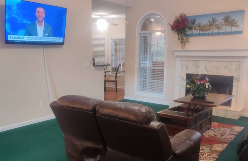 This house is a one-floor house with no stairs, has 3 living rooms, a conference room, a dining room five bedrooms with 2.5 baths. Parking outside that can accommodate about 10 cars, beautiful patio with TV. TV in all bedrooms, living room, conference room, and the kitchen as well. The beautification of the property and closer to the major interstates.