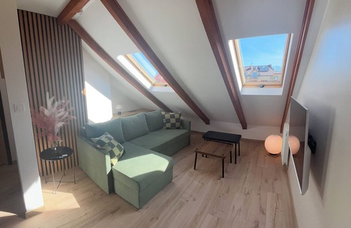 The apartment is located in an adapted, atmospheric attic. Designed for up to 6 people, who can sleep in two bedrooms (Twin bed and two single beds) and in the living room (sofa bed). The apartment has: