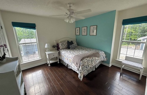 The home's four bedrooms offer restful spots to sleep with hybrid mattresses, cotton sheets, high-end linens, and real hardwood floors. The bathrooms are decorated with granite, newer hardware, fixtures, and hotel-quality towels. The spa-like en suite bathroom in the main bedroom has a large walk-in shower. Additionally, you'll have access to a Smart TV and a ceiling fan for extra comfort. Additional interior perks include a real wood-burning fireplace, board games, new throw rugs, an electronic-controlled thermostat, central air-conditioning, and ample space to spread out and store your belongings so you can stay a while and explore. Enjoy the quiet privacy of 5 acres and the bubbling creek on the property. Kids will love splashing around on its sandy shore and playing in the treehouse or swing set. Older kids can attempt the forest obstacle course on our property or play a round of ping-pong while listening to music. Your crew might even see wildlife while grilling, sipping coffee on one of the two decks, grilling up your dinner, or sharing smores over our fully stocked firepit. Our home provides the perfect space for making memories and reconnecting with those you love. The adventure can continue with visits to Conastee Reserve, Falls Park on the Reedy, Paris Mountain State Recreational Park, or the Swamp Rabbit Trail, all within 5-25 minutes of our home. Before bed, head to the laundry room and throw in your clothes to prepare for tomorrow's adventures. Our place is the perfect blend of rustic charm and modern convenience—book now!