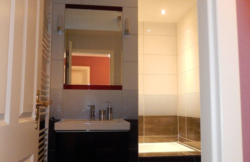 In the 1. Floor leads a wooden staircase (14 steps) in a small hallway with dresser and antique mirror, from here it goes to the bathroom and the two bedrooms. The bathroom with gray high gloss tiles has a bathtub and rain shower, a vanity with two drawers, a large mirror with two additional lights and a towel radiator. A hair dryer with diffuser also per person a bath and a towel are ready.