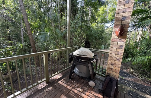 Avalon is ideally suited to a family or couples. Split levels means there are multiple retreats that suit all. On the lower floor is the main air-conditioned bedroom with en-suite and flat screen TV/DVD. Just step off the deck to enjoy watching the birdlife whilst relaxing on the chaise lounges. The Asian inspired main lounge opens to a wide deck with outdoors settings and Weber barbecue. On the next level is a kitchen, which is built for entertaining. Masses of bench space and fully equipped kitchen make self-catering easy. Another more formal dining area completes this level. You can also escape to the back yard and national park for some quiet time bird watching and enjoy a refreshing outdoor shower. The top floor has two bedrooms, a separate bathroom with tub and shower and separate toilet as well as a sitting/reading room with flat screen TV. The top deck additionally has a verandah that puts you up amongst the treetops. The house is fully airconditioned with fans in all rooms. Large screened doors and windows open all areas up to natural breezes.