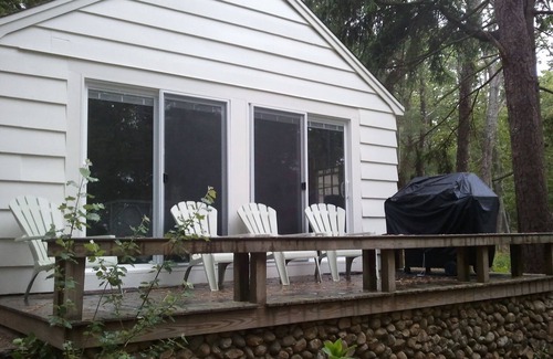 Vacation with friends or extended family in this 'Old Cape Cod' style setting with a large private beach on John Joseph’s Pond. This 3.5 acre private wooded lot has 3 cozy cottages each with its own fireplace and 2 separate kitchens so that you and your friends or family can vacation together but still have privacy when you want it. A covered breezeway connects 2 cottages and a common courtyard allows for the whole group to gather around one or both of the two fire pits. Or follow a short wooded path down to a large private sandy beach for lounging or for swimming off the dock or to the float. Enjoy boating ( several boats available for your use), fishing, or just relaxing during the day. In the evenings enjoy food or song at the fire pits on the beach. And don't forget your dogs or other furry friends!