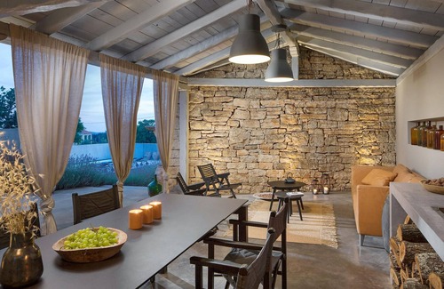 A successful combination of rustic charm and modern style awaits you in this beautiful holiday home in Tinjan. The high-quality interiors offer you maximum comfort while radiating a cosy warmth. The open-plan design and carefully selected details create a luxurious atmosphere that also extends to the outdoor area. You can spend relaxing hours on the covered terrace or enjoy the sun on the comfortable loungers after a few laps in the pool - the perfect retreat for relaxing days.