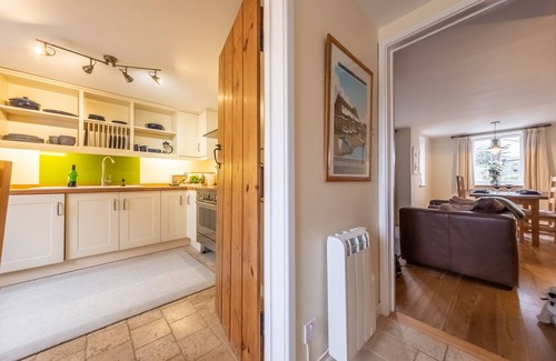 On the ground floor, the very well-equipped modern kitchen provides a table for two, where a quiet early morning coffee can be enjoyed. With an electric Range cooker and plenty of worktop space available, this is the perfect stage for any keen cooks to rustle up a delicious feast made using the local produce that is available right on the doorstep.The L-shaped sitting room has been thoughtfully curated in a relaxed style, to evoke ultimate calm. A wood burning stove set in a feature fireplace adds extra warmth and ambience. French doors open out into the cottage garden, inviting the outdoors in on warm sunny days. With seating for four guests, the dining area benefits from garden views, making it an idyllic spot to create lasting holiday memories. Upstairs, two beautifully presented bedrooms are offered. The master bedroom hosts a double bed, with twin beds provided in bedroom two. With rooms decorated in muted colours, and bed dressed in fine linens, guests will revel in a comfortable deep sleep. This rooms are served by a good-size family bathroom offering bath with shower over.