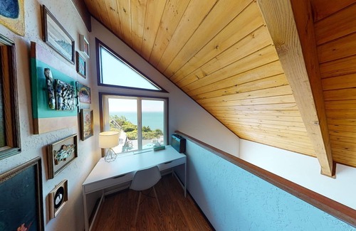 Ocean views, Hot tub, Ocean views of Trinidad Head, Beach & Harbor, Private. Baker Beach House is a hip hideaway perched on an ocean bluff that allows you to embrace the 3R’s: Relax, Reflect and Reboot. Marine lovers and outdoor enthusiasts will adore this beach house. Trinidad’s newest boutique boho compound exudes serenity nestled within an organic modern oasis of redwoods and fern filled foliage. Come, unplug and tune into your thoughts at this mid-century bohemian inspired ocean lover’s paradise. Take in the magnificent, unobstructed ocean views while you ponder your next novel, screenplay or aria from this bright and airy open concept home that features old growth redwood beamed vaulted ceilings and a sleek wood burning stove from Denmark. This cozy and curated home with designer furnishings pays homage to midcentury roots, featuring a modern cook lover’s stainless-steel kitchen with granite countertops. Situated on 4 acres off just above Baker Beach, you can gaze out at Camel rock (lonely rock) from the oversized central picture window. This home is a newly renovated, 3 bed, 3 bathroom home + loft office, and feature an art collection from a life well-traveled.