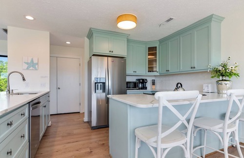 The top floor living area features an updated kitchen with quartz countertops, a long dining table that seats 10, 6 countertop stools, and a outdoor dining table that seats 6. There are two spacious seating areas on the top floor, along with a large television for those movie nights! The living area opens up to porches on both sides of the house. One side is facing the 9th hole tee box on the beautiful golf course and the other side faces the ocean where you can get a small glimpse which has across the street beach access. We have a gas and charcoal grill available to guests too.