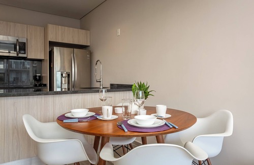 The Iiving Room has a nice and confortable couch with access to the balcony, full equipped kitchen with dish washer, washing and dryer machine.