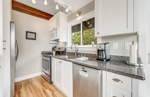 Find ample space to park in the driveway and enter by way of the wraparound deck - a gorgeous spot to admire the bay view, soak up the sunshine in the afternoons, and grill and dine al fresco when the mood strikes. Inside, you'll find a living space that's full of natural light and California coastal decor. There's a living room with a wood-burning stove and a 55' TV capable of Roku streaming, a full kitchen with stainless steel appliances and a breakfast bar for two, and a glass-top dining table by the window. The family room serves as another place to unwind, sporting its own 55' TV with Roku capabilities, as well as a lovely glimpse of the outdoor scenery.