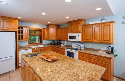 The kitchen is equipped with a refrigerator, microwave, stove, dishwasher, oven, toaster, traditional coffee maker, and Keurig, blender, and crock pot.