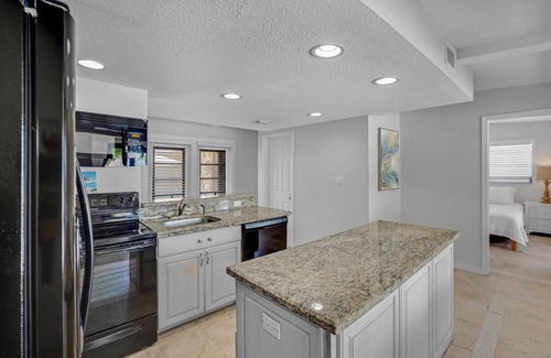 'Bayhouse' is only a few yards from the beach and has lovely water views. There is a fully stocked kitchen for making delicious family meals, marble floors, French doors, a washer and dryer, a Jacuzzi tub in the master bedroom, plus all the amenities of home. You can even bring your pets without worry because there’s a fully fenced backyard! We also provide kayaks and paddleboards for guest use!
