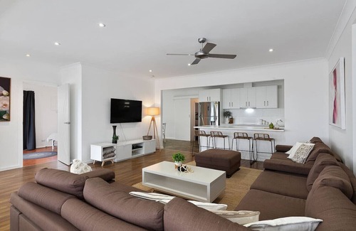 This spacious four-bedroom holiday rental comfortably sleeps up to 17 guests, making it perfect for large families or groups. The home features a modern kitchen with microwave, washing machine, air-conditioning, widescreen TV, video and CD player, elegant dining area, and a luxurious lounge room for relaxing together.