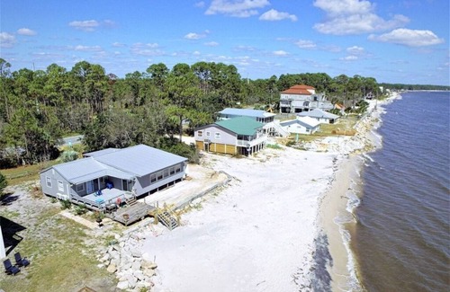 This 4 bedroom, 2 bath bay front beach cottage has a old Florida feel with modern luxuries. From stainless steel appliances in the kitchen to the flat screen, smart t.v. in the living room and WIFI this home is tailored to fit everyone's needs. With plenty of sitting space you can enjoy breakfast with panoramic views of the bay or feast like kings at the large dining room table. With 4 bedrooms this home sleeps 8 comfortably. One full bathroom inside and another full bathroom outside makes washing up from the beach easy! Just a few steps from the back deck your oasis awaits!