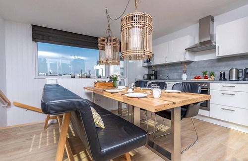The open-plan living/dining area on the upper floor of the property boasts floor-to-ceiling panoramic window fronts. Water as far as the eye can see. From here you can access the directly adjoining wind-protected terrace, whether for breakfast together or a convivial barbecue evening, harbour cinema is guaranteed here. One level higher is the roof terrace with a 360° view of the Schlei, the harbour entrance and the marina, a special highlight. Here you can relax on a large sunny island.