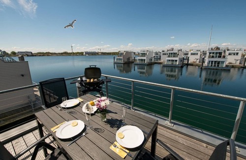 This floating house extends over three levels and offers space for six people. The open-plan living and dining area with all-round water views, fully equipped kitchen and adjoining terrace is located on the upper floor. From here you can access the spectacular roof terrace with views over the sailing and sports boat harbour, the Schlei and its estuary into the Baltic Sea. Equipped with high-quality garden furniture and a Weber electric barbecue, the terraces offer a pure holiday feeling and breathtaking sunsets.
