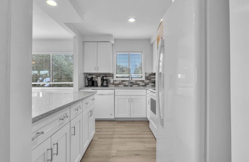 This home features a sleek updated kitchen with quartz countertops and shaker cabinets that received major renovations during the winter of 2022 to include luxury vinyl flooring and interior paint throughout, tankless water heater, sliding glass doors, an electric fireplace for cozy evenings, ceiling light fans, modern bathroom vanities and mirrors and coastal-inspired furnishings.