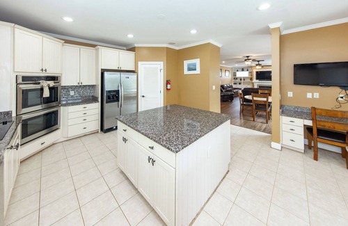 The mid level of this home bolsters an open concept living space with 55-inch HDTV with access to the back deck. The newly updated kitchen shines with granite counter tops, stainless steel appliances (including double oven), and coastal style cabinetry. The dining area is located adjacent to the kitchen and offers enough space to seat everyone! You will also find 2 additional bedrooms both Kings with ensuite baths on this level.