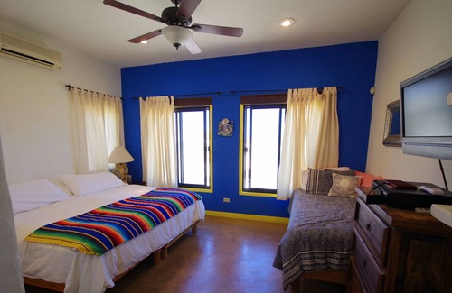 Casa Vista Cerralvo is located directly on beach with no stairs or hills to climb. Beautiful secluded beach home located on 1/2 acre directly on the beach. The main house has 4 bedrooms 3 baths total. 2 bedrooms, 2 bath upstairs. Each bedroom has a king bed plus one has a twin and the other has a double futon, full kitchen-living room with island with 4 stools, dining table that seats 10. Patio dining table that seats 6. Downstairs is a completely separate 2 bedroom 1 bath unit with a fully equipped kitchen-living-dining area and great covered patio with dining tables and huge outdoor bed. Lounge chairs on the deck. 1 bedroom has a king bed and 1 has a queen plus a bunk with 2 twins.. 3 New studio separate casitas with full kitchen and great patios garden king bed casita for the beachfront king, both with amazing sea views. 1 new 1 bedroom casita with full kitchen and great patio Best Kiting beach around without the crowds. Self-launching rope on the beach. 3 outdoor showers.