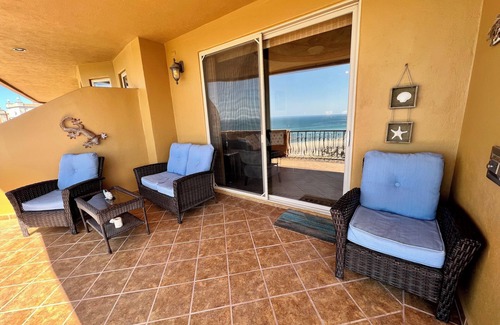 Located in the E building which is the closest to the ocean, this 7th-floor one-bedroom penthouse is one of the kind with a spectacular view of the Sea of Cortez and Old Port from your own balcony! It features high ceilings, granite countertops, slate floors, and a large patio accessible from both the bedroom and living room. The sofa and love seat in the living room can turn into a queen and a single bed if needed.