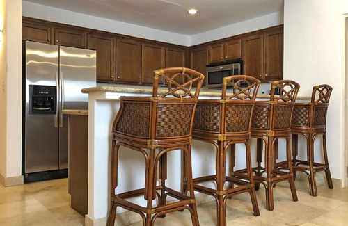 Situated right in front of the beach, this beautiful condo has great views. It has a full well equipped kitchen, the master bedroom has a king sized bed, second bedroom with two full beds, both with their private bathroom and 55” Tv’s, and the Living room has a big screen tv (75inch), Apple Tv, cable tv, Full Bathroom, pull out couch with memory foam mattress and large balconies in every room with pool and sea views. There's a gas barbecue grill on the balcony to cook some steaks or your catch of the day!