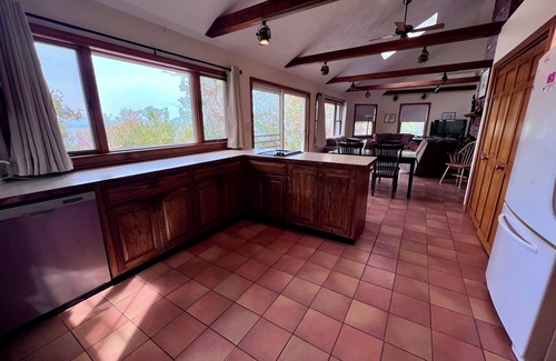 Head upstairs to the second floor, designed as an upside-down house for stunning bay views. The expansive open-concept kitchen is a chef’s dream, perfect for group cooking and gatherings. Enjoy meals at the eat-in breakfast bar or gather around the dining table, all while the adjacent family room invites relaxation and conversation.