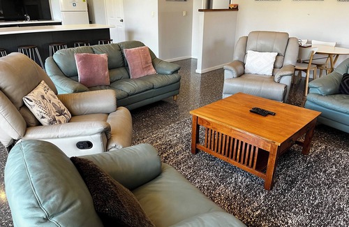 A large well appointed kitchen includes a breakfast bar and opens onto the spacious lounge with high ceilings, comfy lounge and large TV. The kitchen is equipped with a dishwasher, microwave, fridge and kitchen utensils.