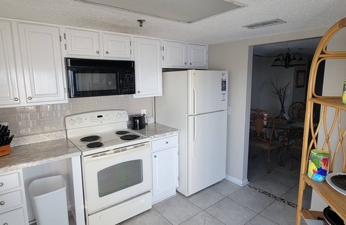 -The unit is tile throughout with an updated, fully-equipped kitchen with blender, toaster, dishwasher, ice maker, gadgets, etc.