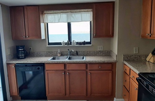 - The kitchen, living room, and master bedroom each have eight foot sliding glass doors opening onto the balcony. We love to relax out there and watch the people, dolphins, and ocean.