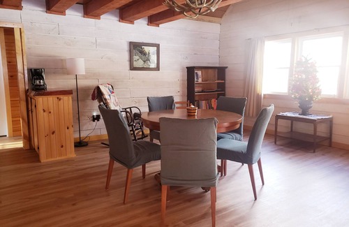 Upon entering the cabin, guests notice the large open area with a sunroom, dining room and kitchen. This open space is great for families and small groups to gather for eating as well as relaxing and enjoying various activities together or apart. Above the main room is the sleeping loft, a great space for kids to also play, read, and hang out. The bathroom and two bedrooms offer comfortable and quiet privacy from the main area of the cabin.