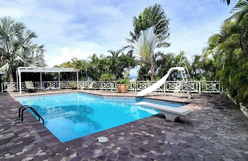 This beautifully renovated one-bedroom ground floor apartment is in the heart of Frigate Bay. It boasts stunning views of both the Atlantic and Caribbean oceans. You can watch the sunset from the patio and enjoy the swimming pool featuring a diving board and slide. The property is just a 2-minute drive to Frigate Bay, a lively area with plenty of activities day and night. Its proximity to the island's best nightlife, shopping, restaurants, and top hotels makes it an ideal location.