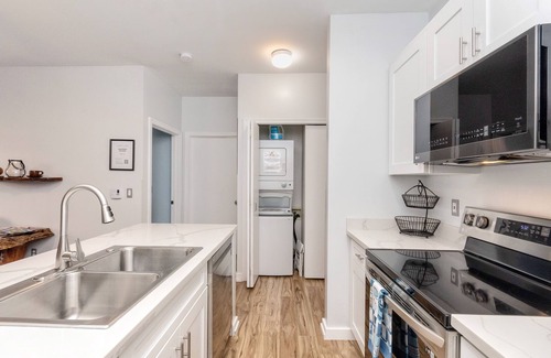 Our home has modern furnishings, a flatscreen TV in high definition in the living room and a smaller flat screen in the bedroom- both with rokus. In this space, you will have 1 brand new king sized bed in the master bedroom and 1 sofa bed (it is actually comfortable!) in the living room to add an extra sleeping option when needed. The kitchen is fully equipped to please any cook, and there is a washer/dryer in the condo for your convenience. Tall oversized windows throughout the condo provide plenty of natural light and a beautiful view of the courtyard garden. Our home also includes wireless internet.