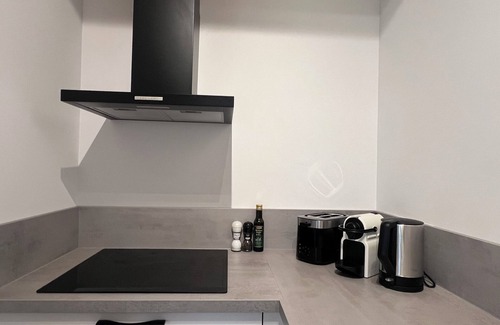 Ground floor: (Living room(TV, dining table(6 persons), seating area), open kitchen(hob, electric kettle, hood, coffee machine(filter), oven, dishwasher, fridge-freezer), toilet(washbasin, toilet), terrace(private))
