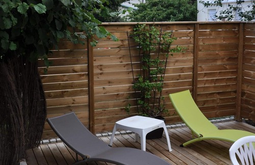 Private outdoor area, grass side, with garden furniture, sun loungers and barbecue.