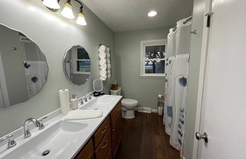 Enjoy a stay at The Farmhouse with cows in your back yard. Beautiful mountain views while you sit on the back porch and front porch sitting with deer in the front yard, your stay at The Farmhouse will be one you will never forget. Enjoy the firepit area, the game room, the big screen tv, the Blackstone and gas grills on the covered back porch, and the cozy feel of living on a farm. Fully stocked kitchen with a range, microwave, dishwasher and refrigerator. A coffee bar with a Keurig and traditional coffee makers with coffee, K pods, Hot Chocolate, and assorted teas to choose from. Available electric hookup and covered area for your boat in the basement drive and multiple boat docks available in the area.