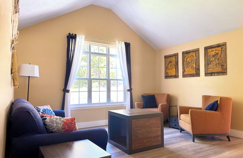 With over 2,800 sq. feet, you will have plenty of room to spread out over the 2 separate floors. There are 4 bedrooms 3 bathrooms and don’t forget the dedicated work area located in the walkout basement. The master bedroom has a king size bed and huge walk in shower with two heads. One for a handheld sprayer and another for the biggest raindrop shower you have ever seen! The second and third upstairs bedrooms both have queen-sized beds and their own Roku televisions. The fourth bedroom is located downstairs in the walkout basement and has its own bathroom. The walkout basement also boasts a large sitting room with a sofa and chairs and a dedicated work area for those times when work has to be done at home. The washer and dryer is conveniently located on the first floor.